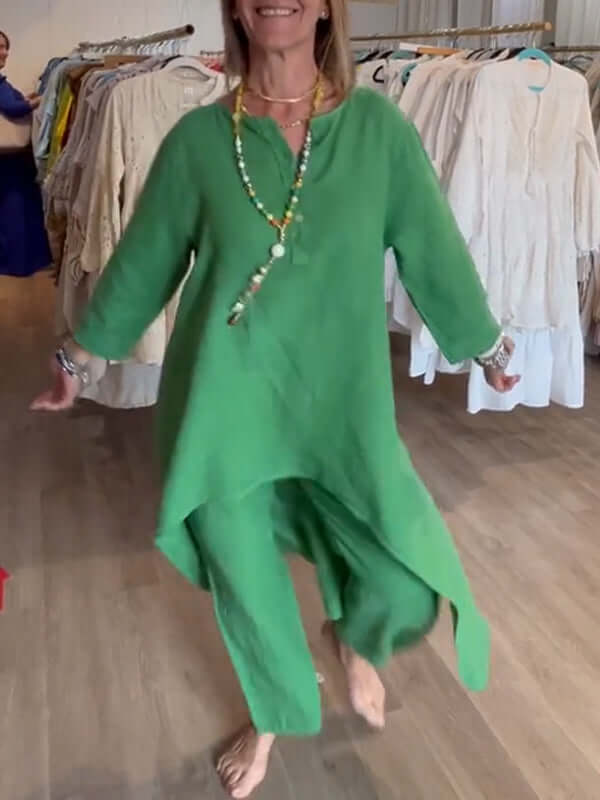 Linnen dames set met broek met wijde pijpen en top met ronde hals - Sarah