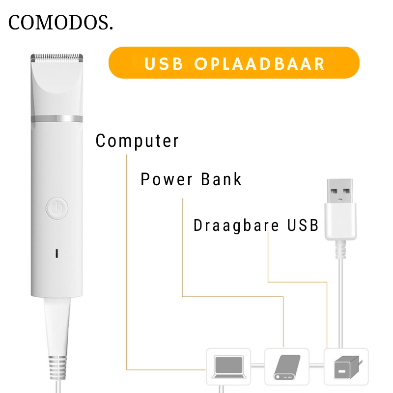Het mesgedeelte van de trimmer kan worden verwijderd voor eenvoudig schoonmaken, zelfs onder water. Ons scheerapparaat voor huisdieren is oplaadbaar via USB, zodat je altijd en overal kunt trimmen. Slechts 3,5 uur opladen geeft je tot 3 uur continu gebruik.