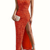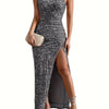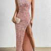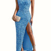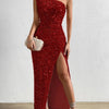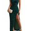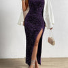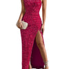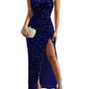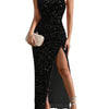 Elegante one shoulder maxi avondjurk met split en lovertjes