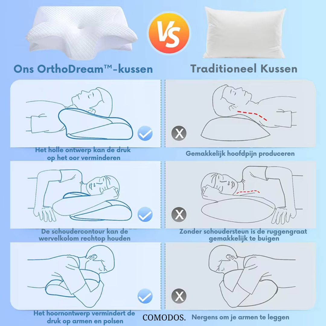 Na 2,5 jaar nauwgezet onderzoek en testen is het OrthoDream™-steunkussen een viraal fenomeen geworden dat talloze mensen helpt om slaapgerelateerde ongemakken te overwinnen. Sluit je aan bij meer dan een half miljoen tevreden klanten die eindelijk pijnvrij en fris wakker worden.