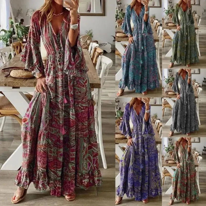- Deze jurk heeft een uniek Boheems ontwerp, perfect voor wie houdt van een vleugje etnische charme in zijn garderobe. De bloemenprint en uitlopende mouwen voegen een vleugje elegantie en verfijning toe.