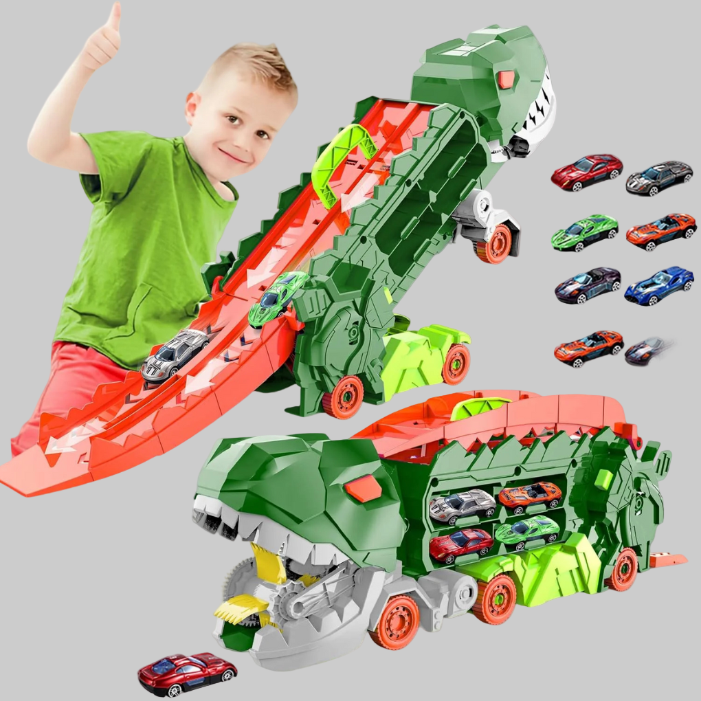 Beleef fantasierijke avonturen met de Dino City Transporter, die een racebaan combineert met een transformerende vrachtwagen. Kinderen kunnen voertuigen laden, overschakelen naar de racemodus en het plezier in verschillende speelscenario's zien ontvouwen. Perfect voor kinderen die graag auto's en dinosaurussen combineren in hun verhalen.