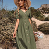 • Chique en tijdloos ontwerp: Met zijn elegante V-halslijn en speelse knopen aan de voorkant straalt onze jurk verfijning en charme uit, waardoor hij perfect is voor elke gelegenheid, van stranduitstapjes tot brunchafspraken.